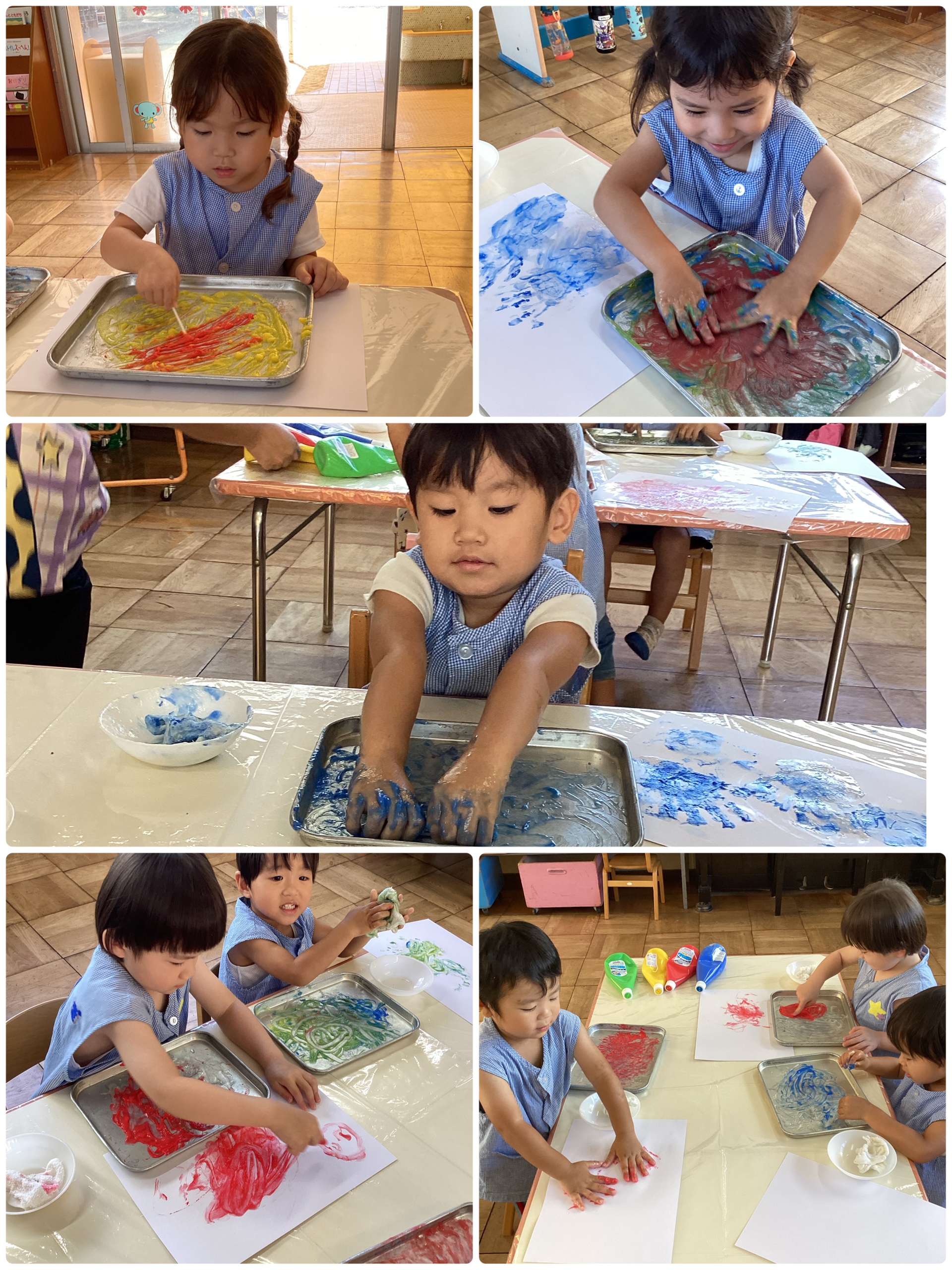 絵の具で色つけて、色を混ぜたり、水をたしてやわらかくしたり、のりの感触を楽しむことができました!