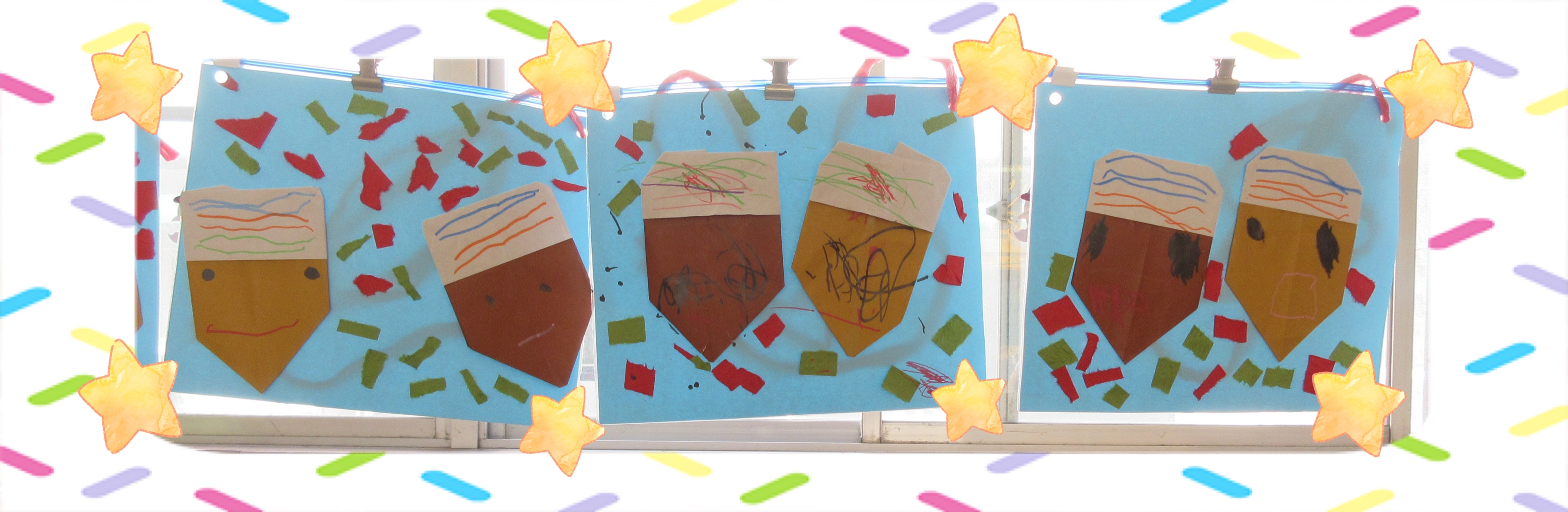 その後は和紙を指でちぎり、折ったどんぐりと一緒に貼りましたが…