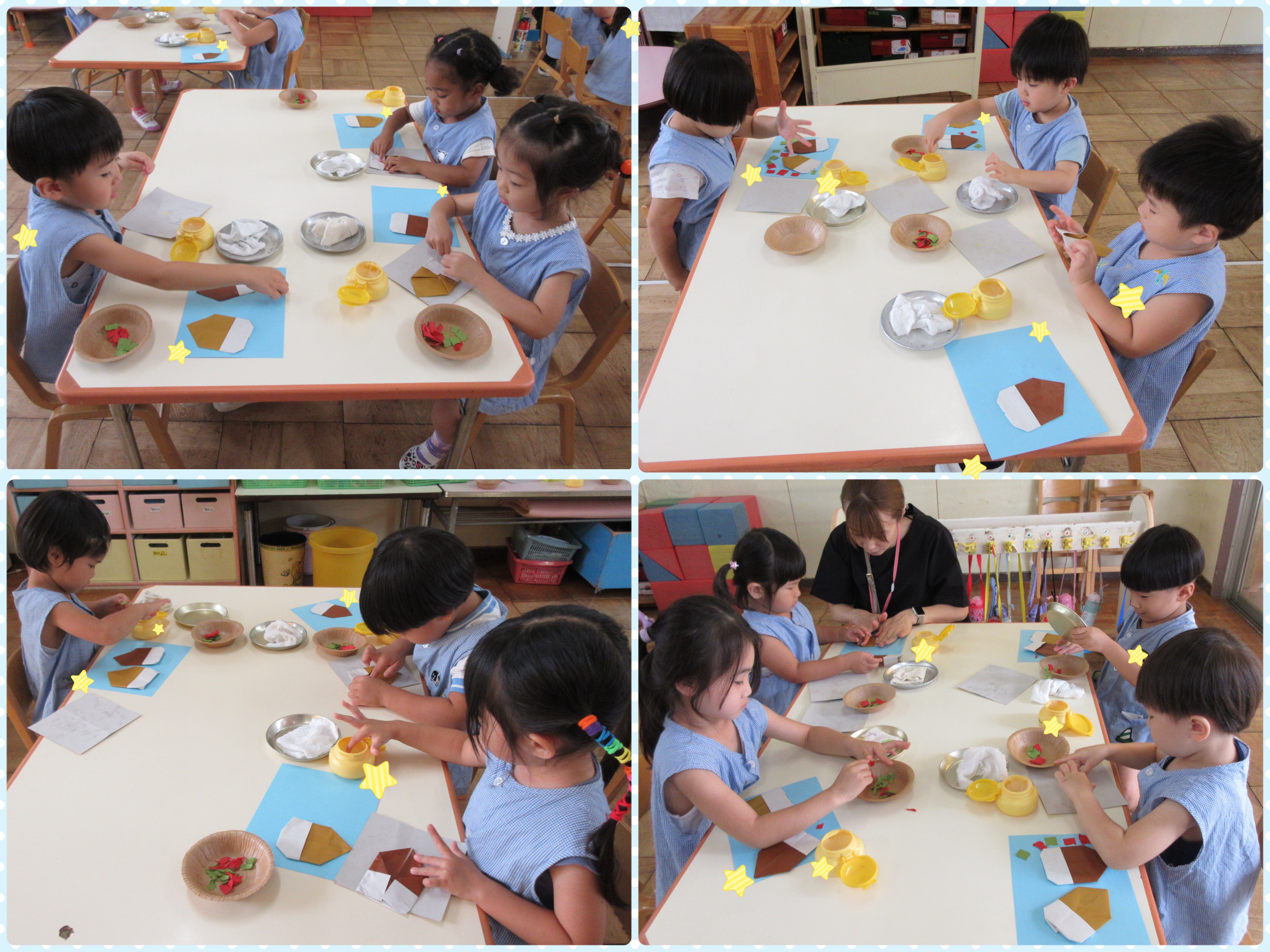 「せんせーい!」という声で見に行くと、指にびっしり和紙が付いてる子がいっぱい(^^;)