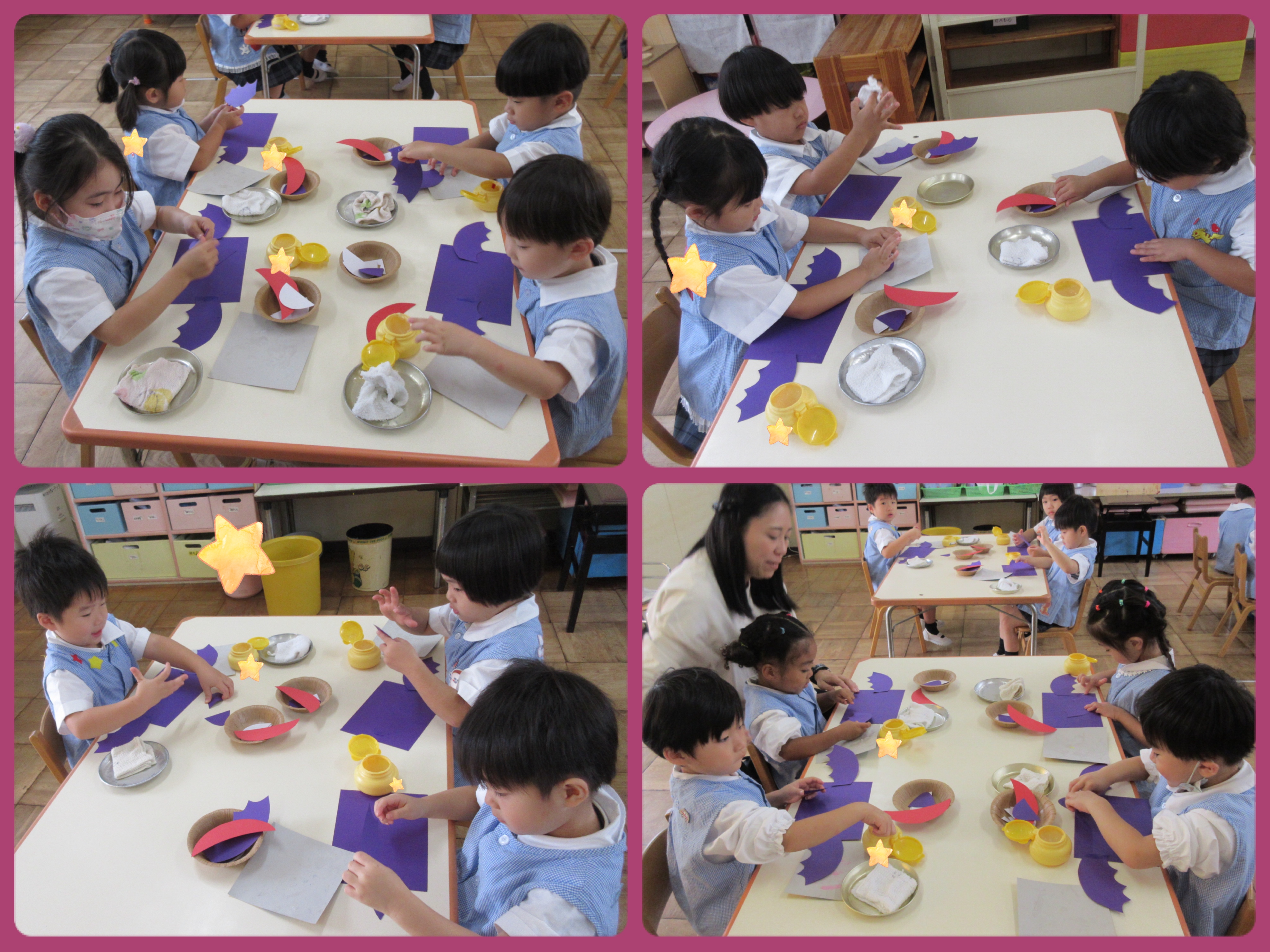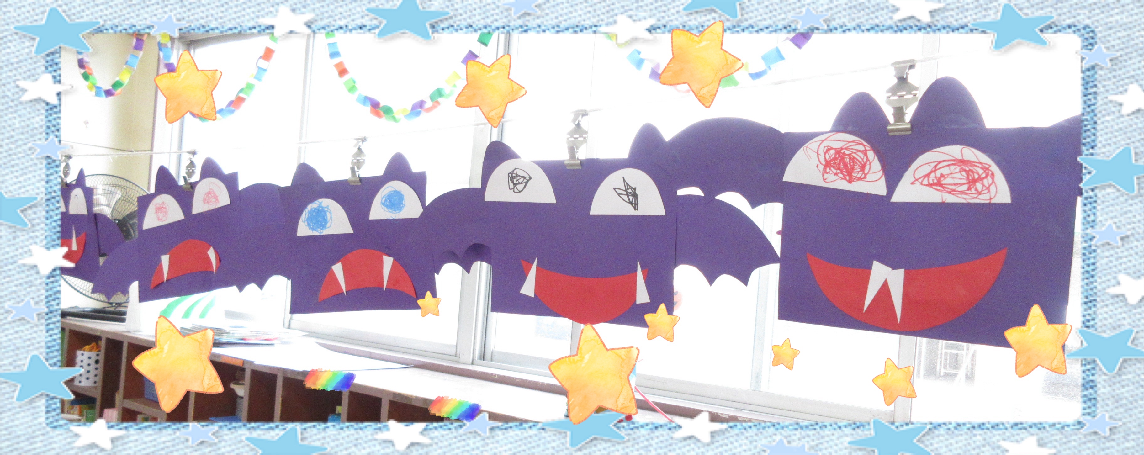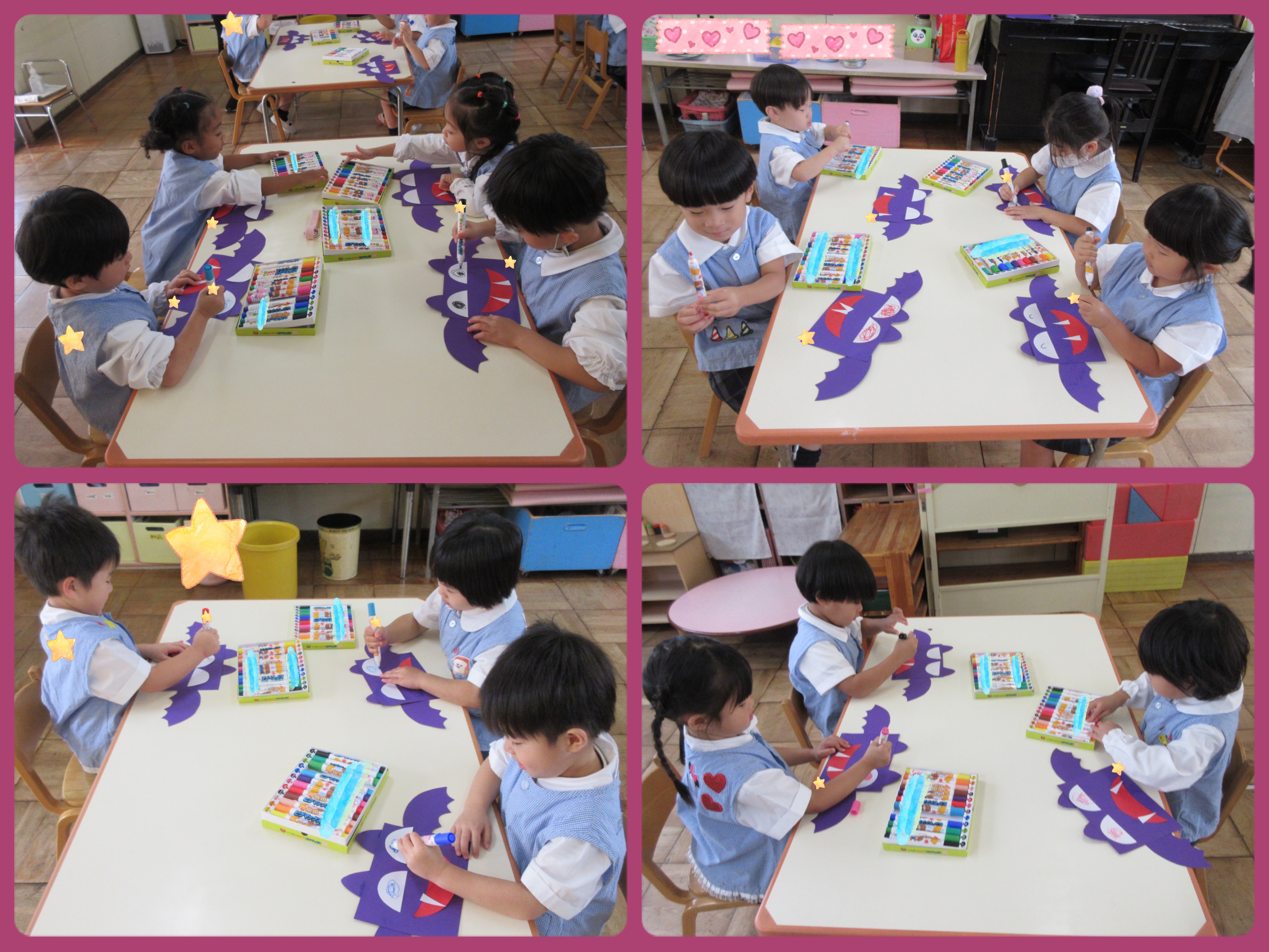 コウモリの羽や顔をのりで貼り、どんな目の色にしようかな〜、と考えて作りました♪