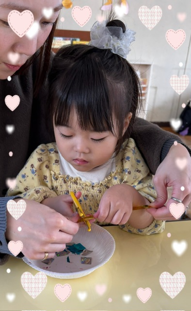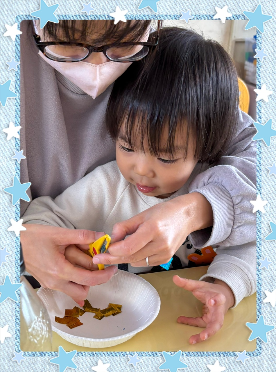 ママと一緒に、はさみチョキチョキに挑戦です!