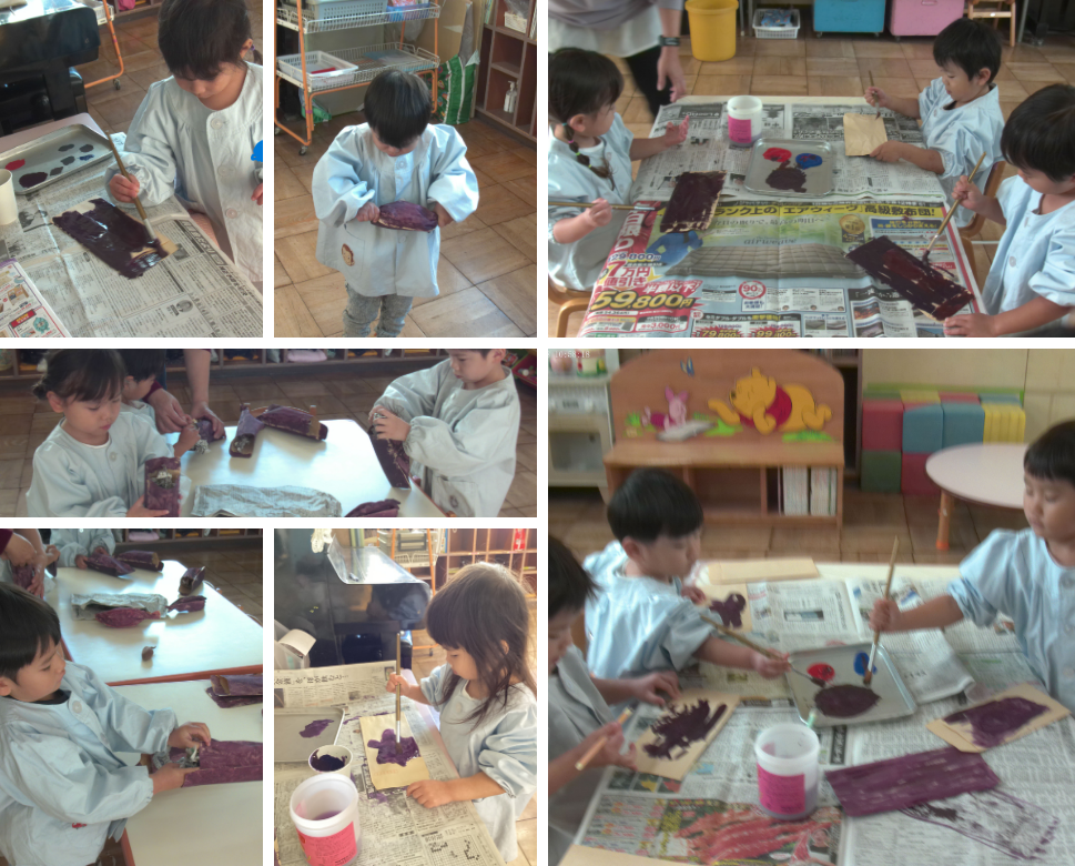 お部屋では、採ったお芋をみながら、制作をしました。赤と青の絵の具を混ぜ、さつまいもの色を作り、封筒に筆で塗りました。上手に筆を使って、塗る感覚を楽しんでいました!乾いたら、新聞紙を詰め、さつまいもの形を作りました。❝ギュッ、ギュッ、ねじねじ❞と「キャンディーみたい!」といいながら、お芋を作りました。