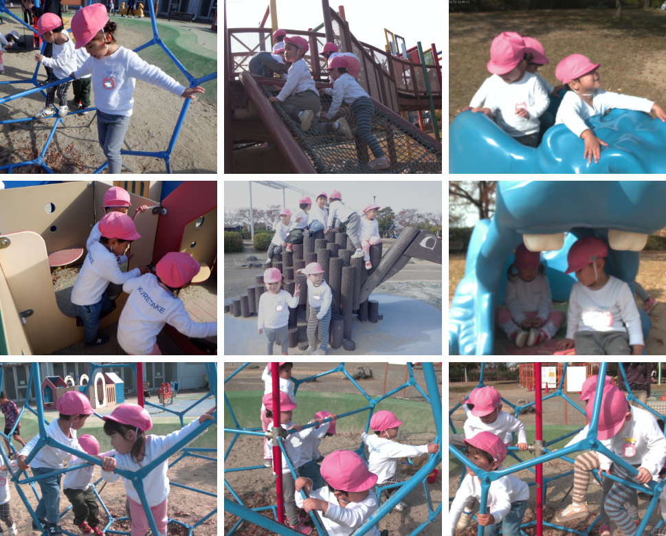 この日は、県民ホリデーの週に加え、連休前ということで、家族連れや子どもたちの団体がたくさん来られていたので、譲り合いながら、大型遊具で遊びました!広い場所に気分も開放!あっちに行きたい!、こっちで遊びたい!と先生たちも振り回されながら見守りました!なので写真があまりとれていませんが、お届けできるだけ、載せておきます。