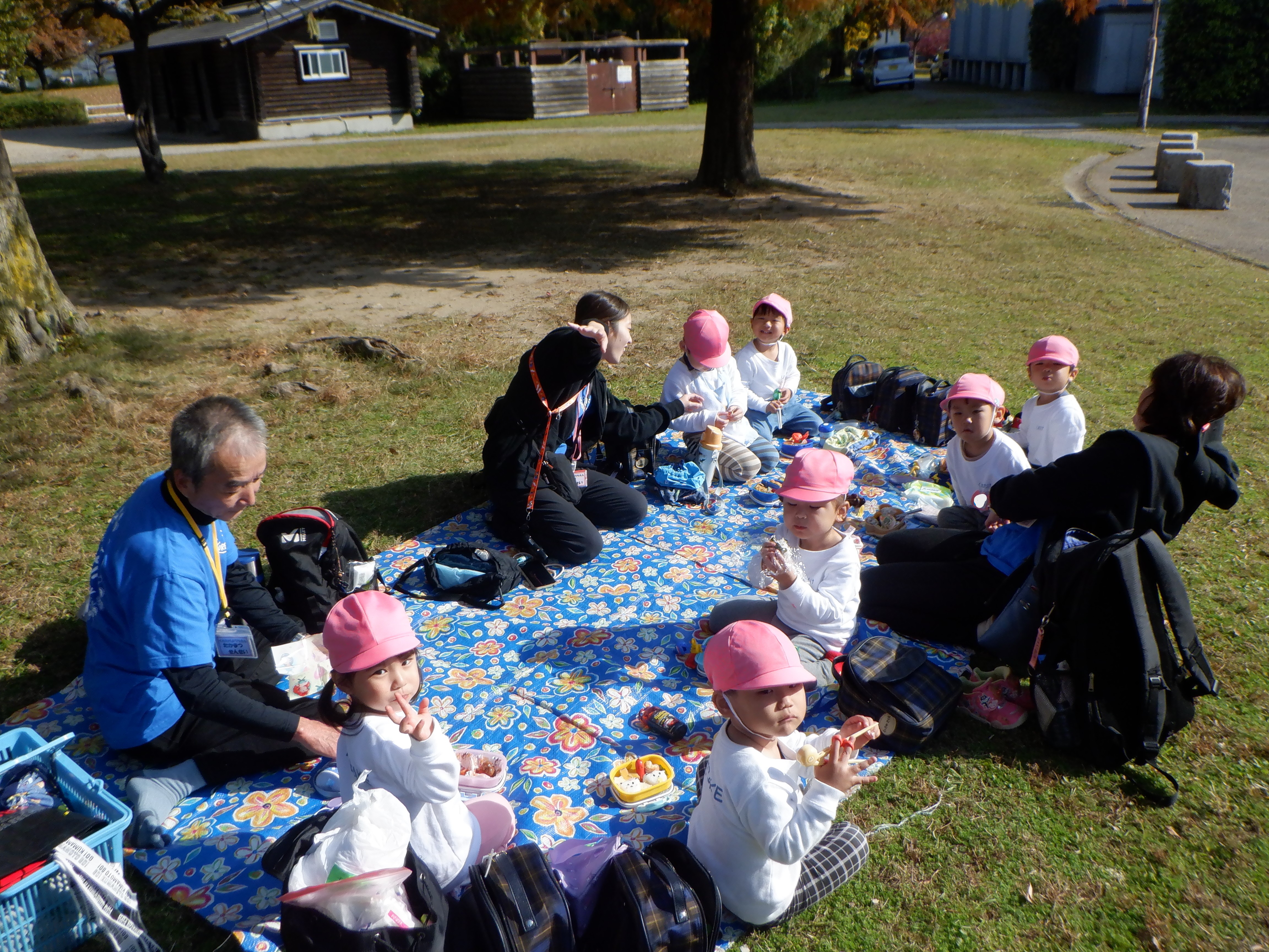 お弁当は、ぽかぽか陽気の中で、シートを敷いて食べました。大好きなものがたくさん入ったおいしいお弁当はあっという間にペロリといただきました!お菓子もニコニコで食べていました。