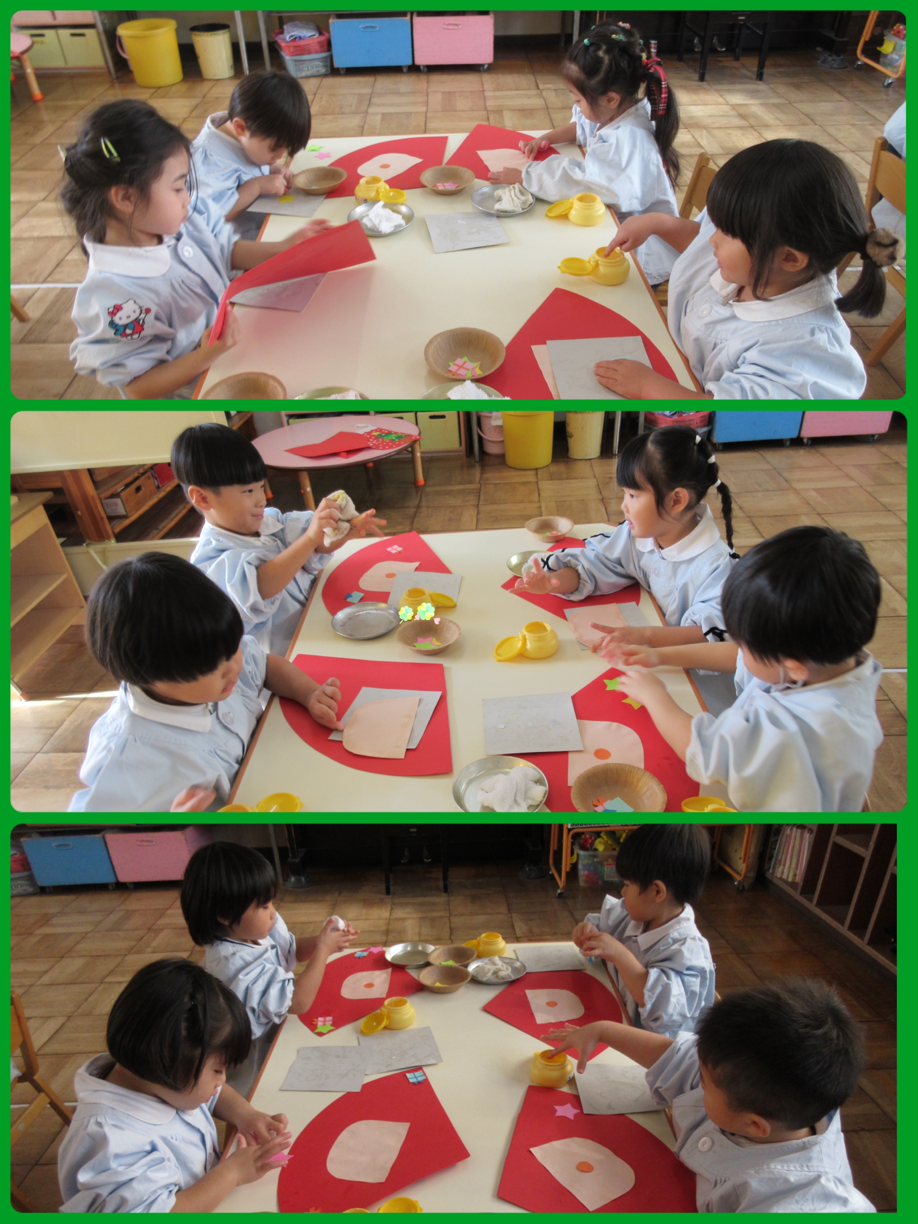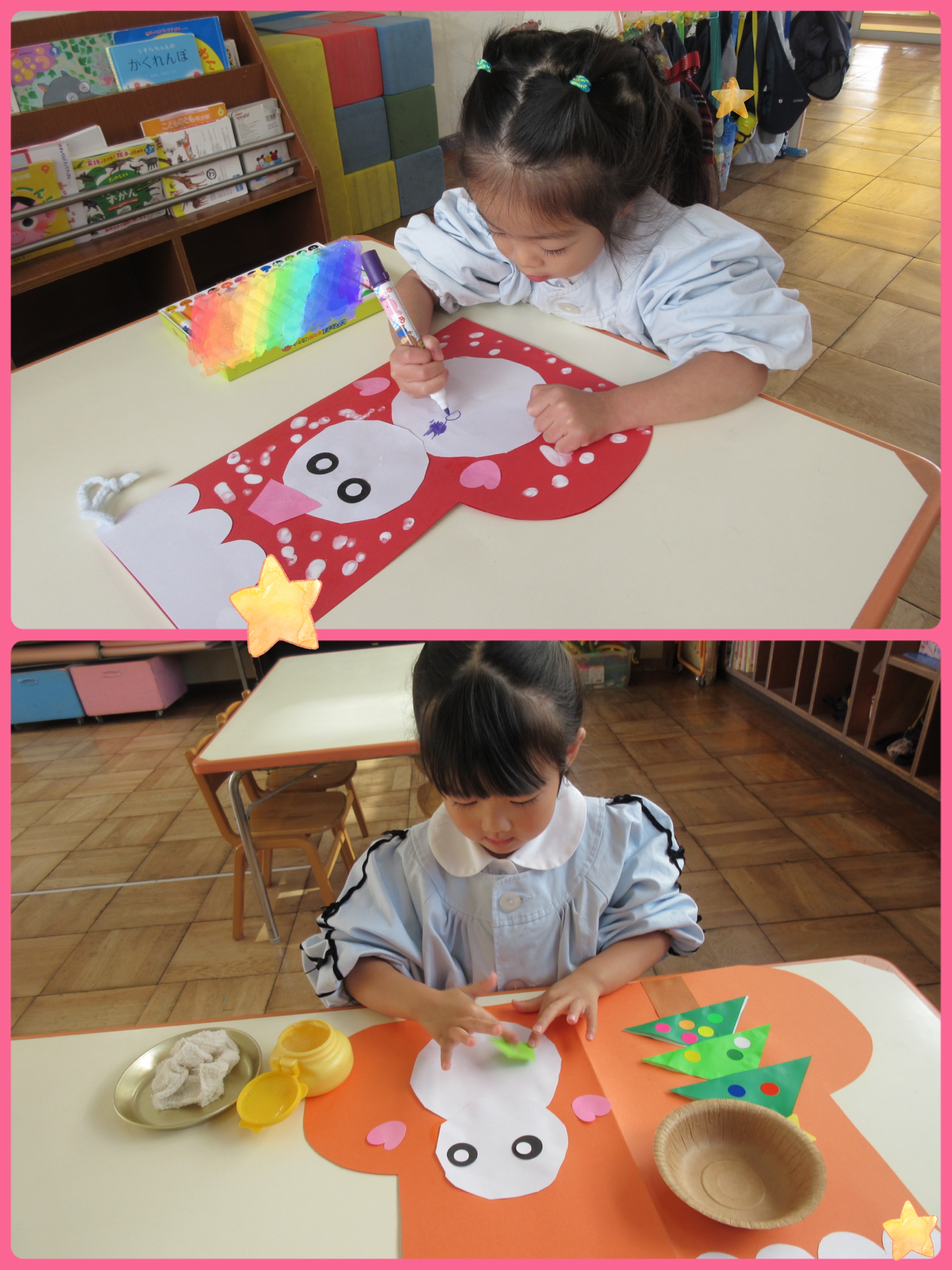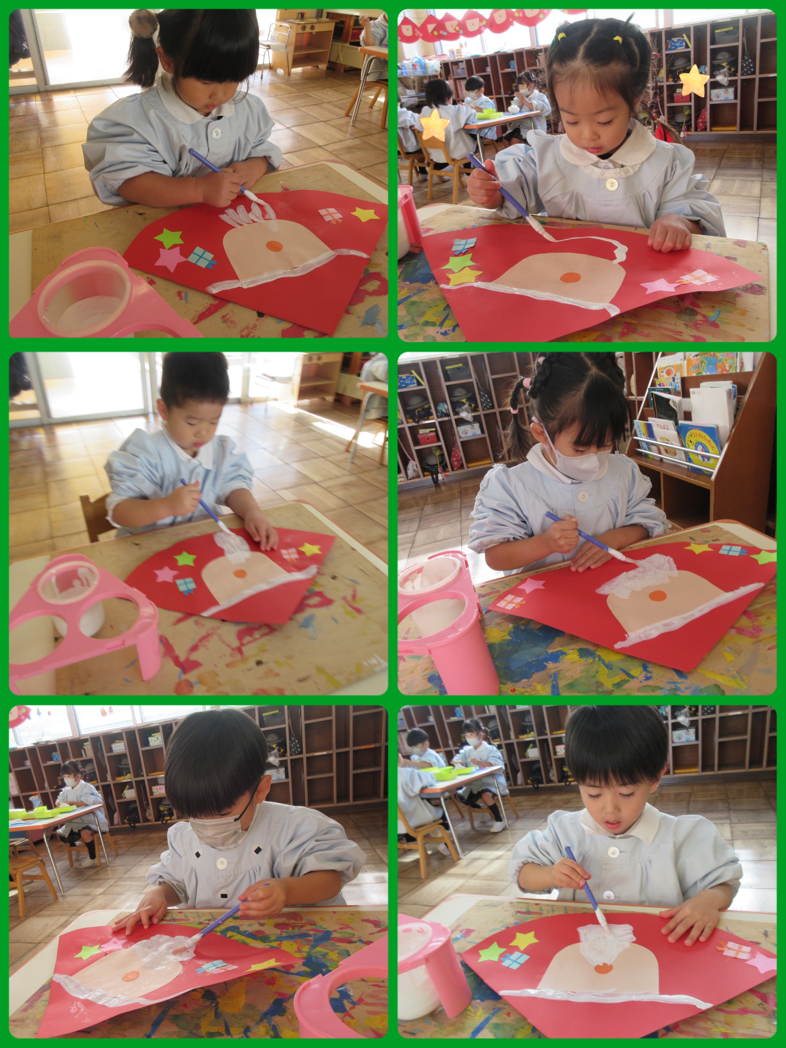 1日目は赤い画用紙の真ん中に顔を貼り、空いている所に星とプレゼントを貼りました。