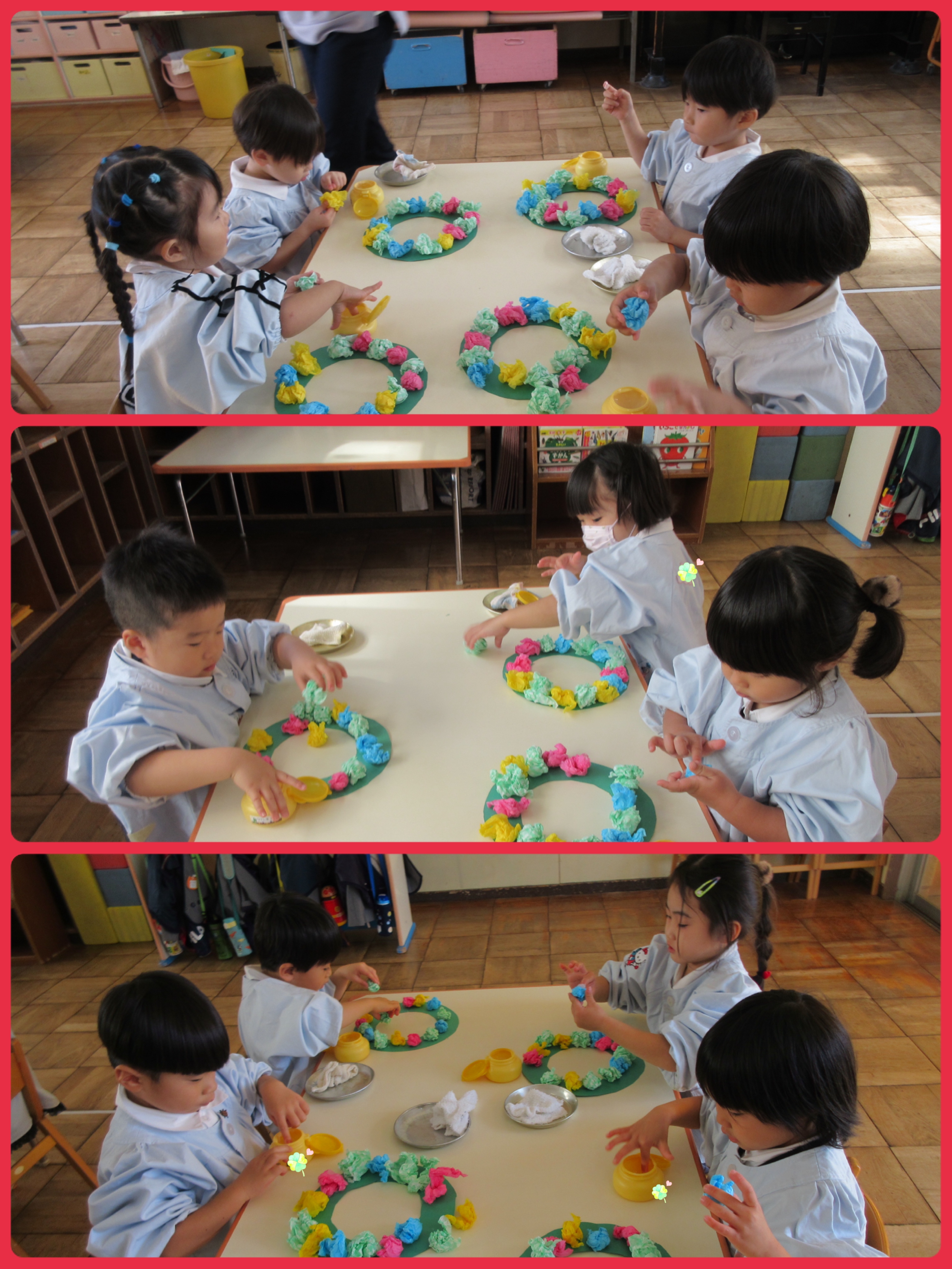 お花紙を丸めてのりで貼り、真ん中には折り紙で折ったサンタさんも付けました♪