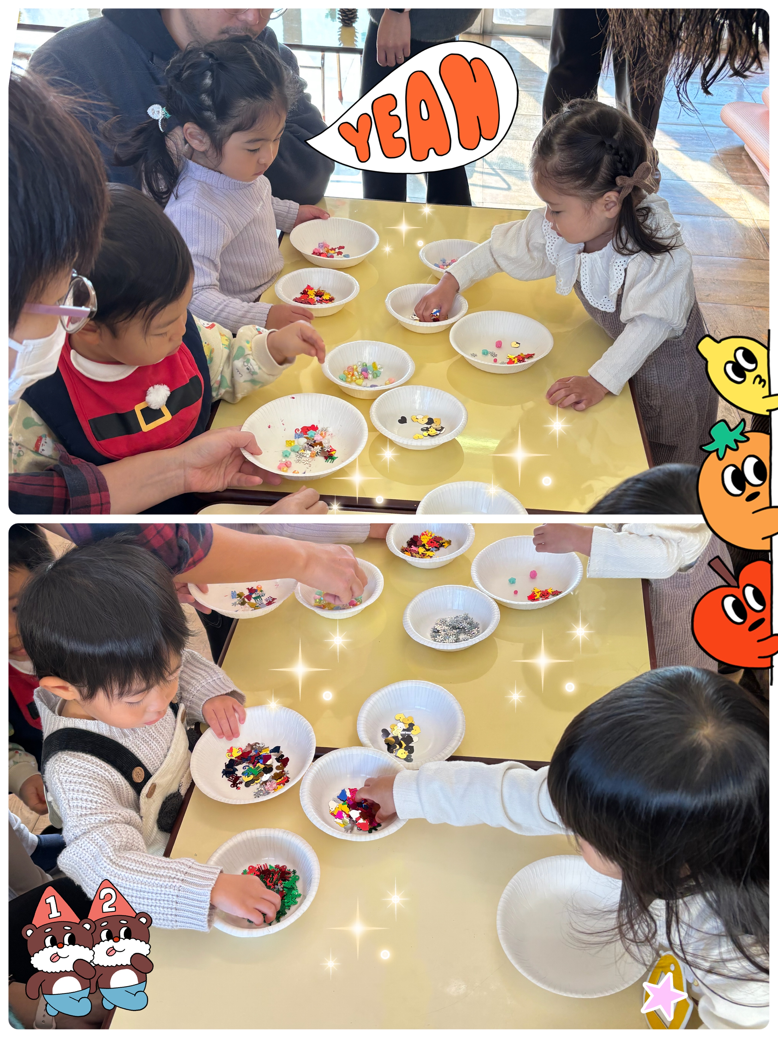 キラキラのスパンコールやビーズ、カラフルなポンポンをパパやママと一緒に選びます。