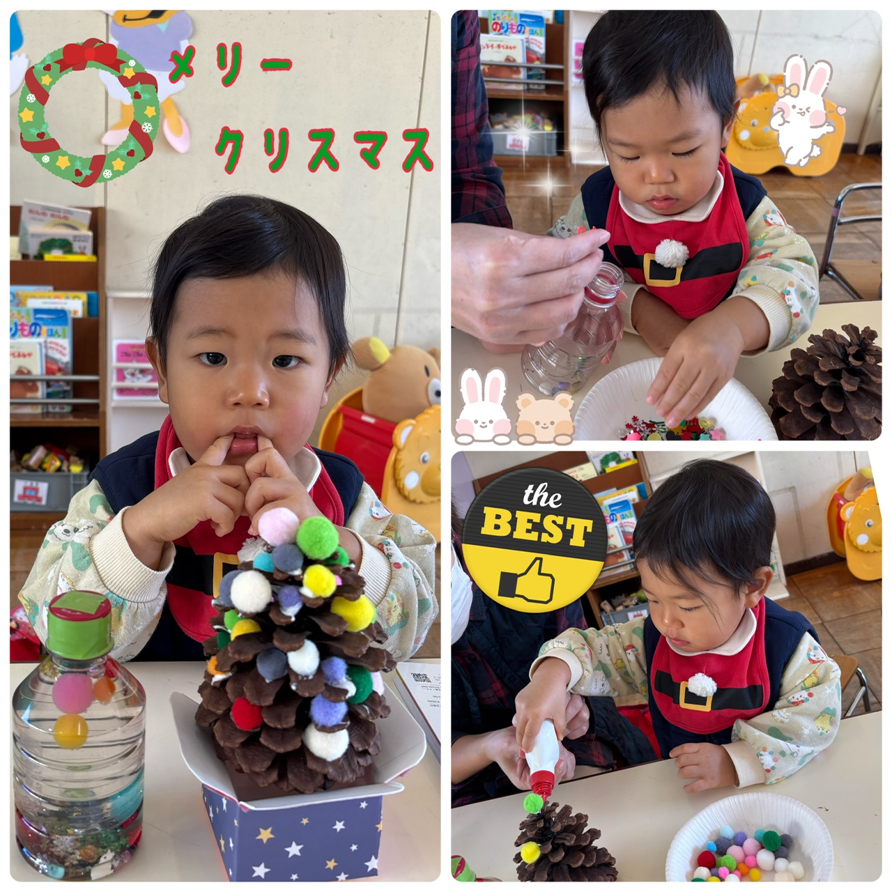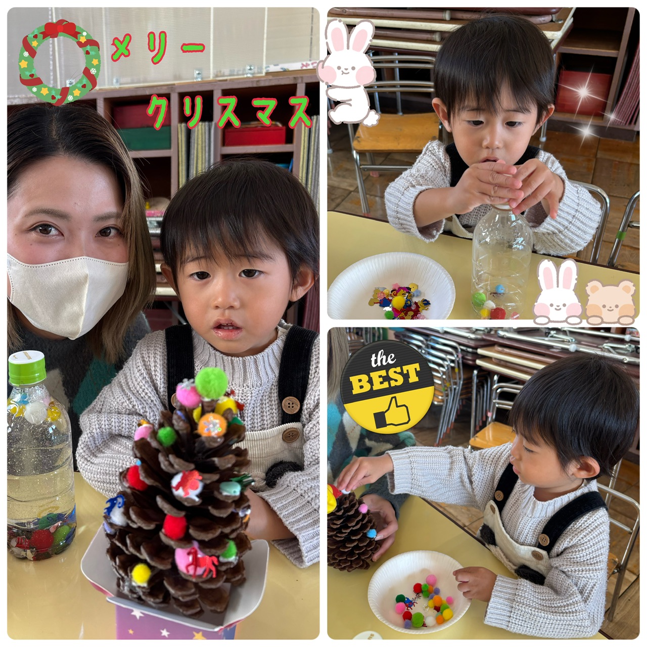 クリスマスツリーは、なんと先生が大きな大きな松ぼっくりを持ってきてくれました!