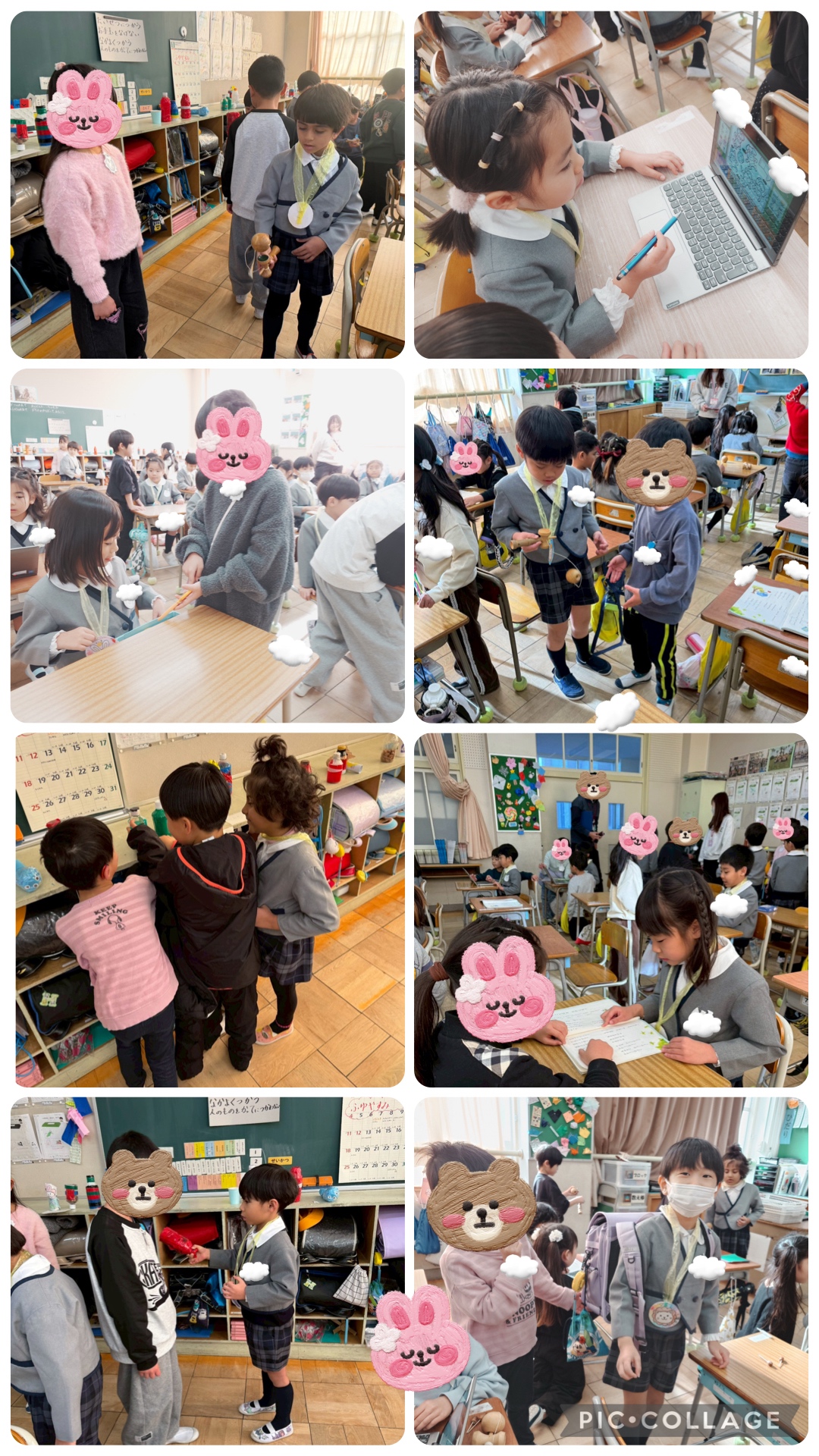 教科書を見せてくれたり、ワークをやらせてくれたり、お道具箱の中身やけん玉やどんぐりコマ。
