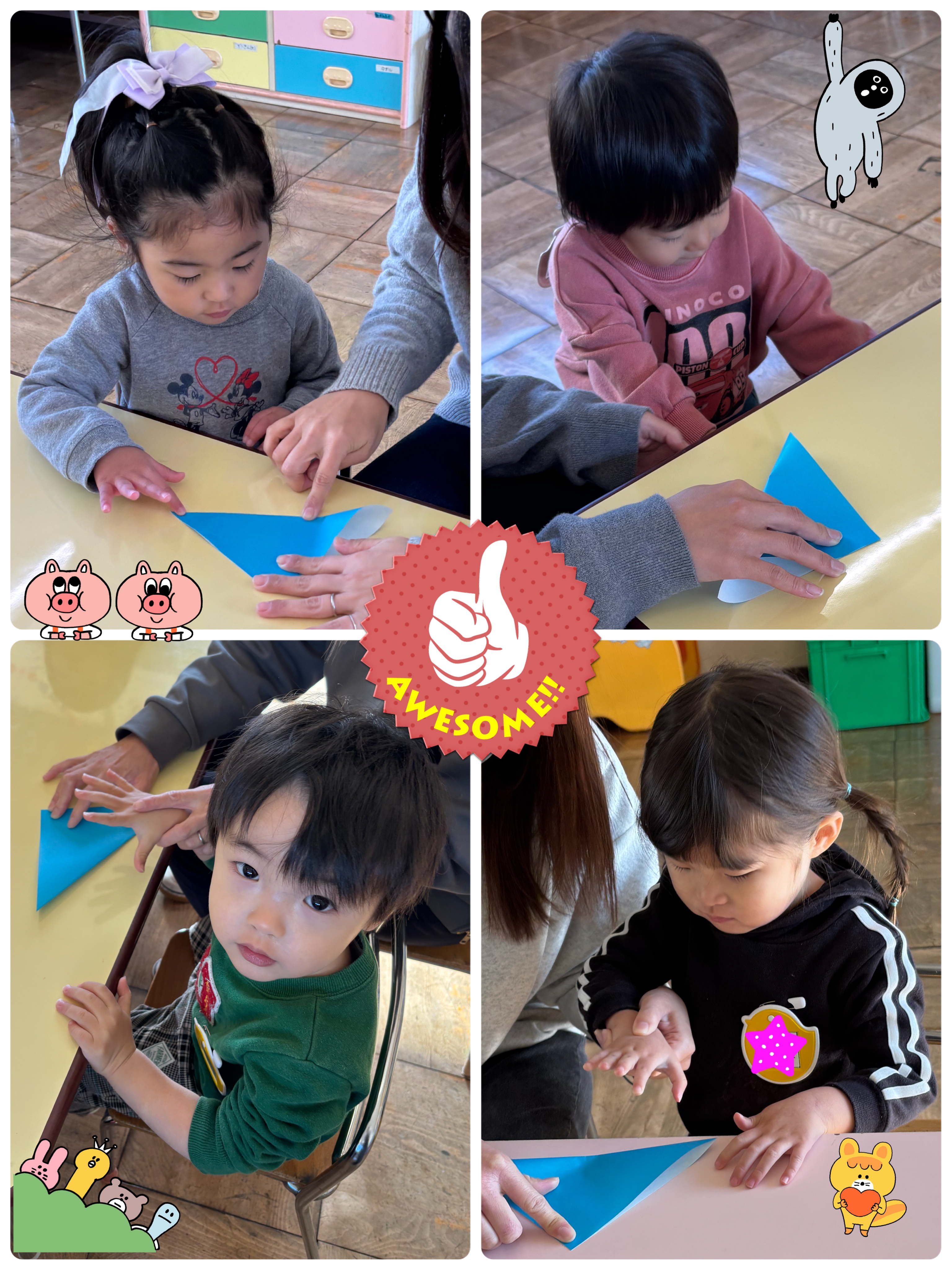 ママに手伝ってもらいながら、角を合わせて折り線をつけたり、ママが折ったところにアイロンの仕上げをしてくれたりと、みんな集中して取り組んでいましたね(о´∀`о)