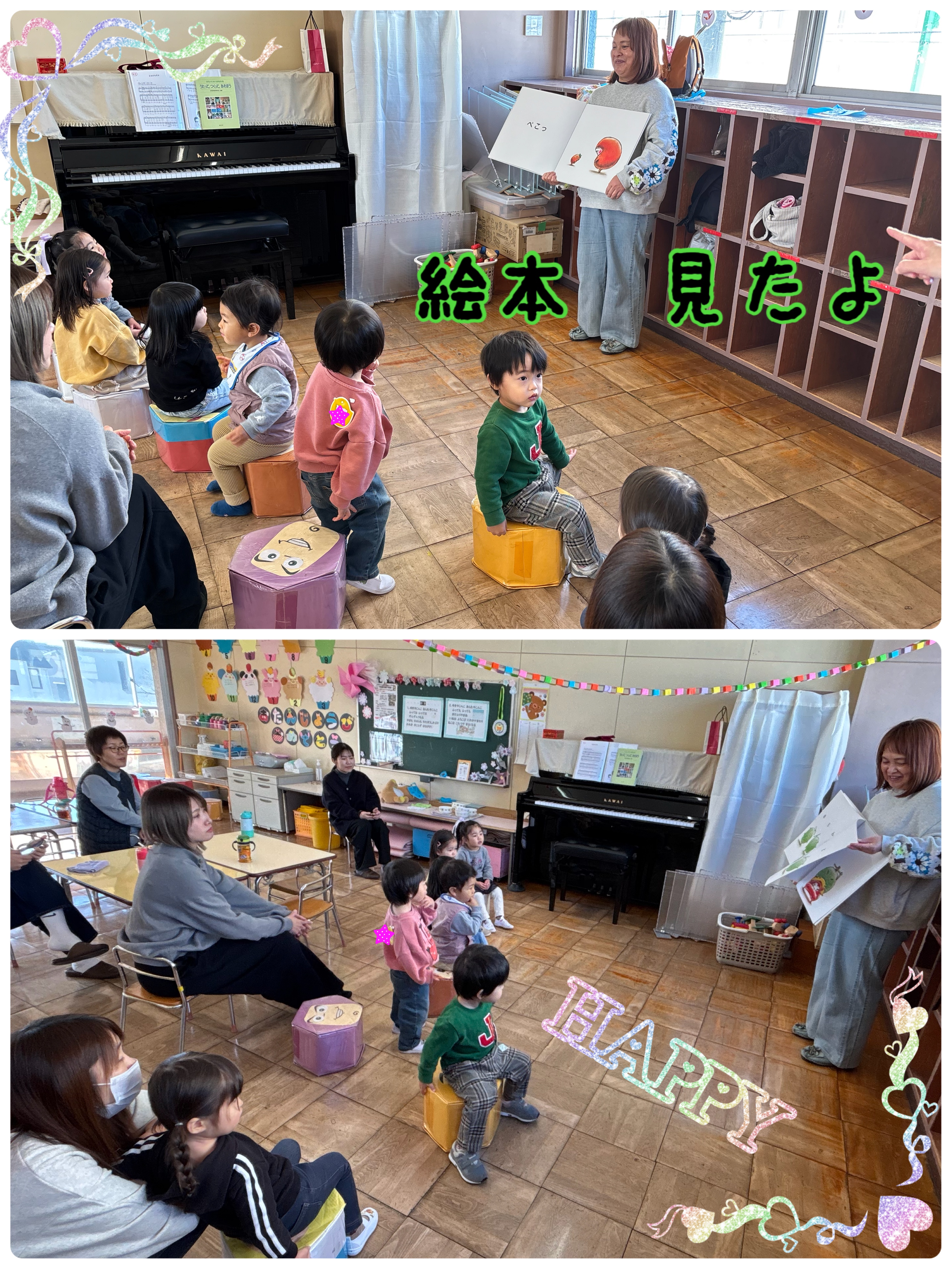 絵本の前にイスを並べて、プチさん達だけで座って見ることができましたね!