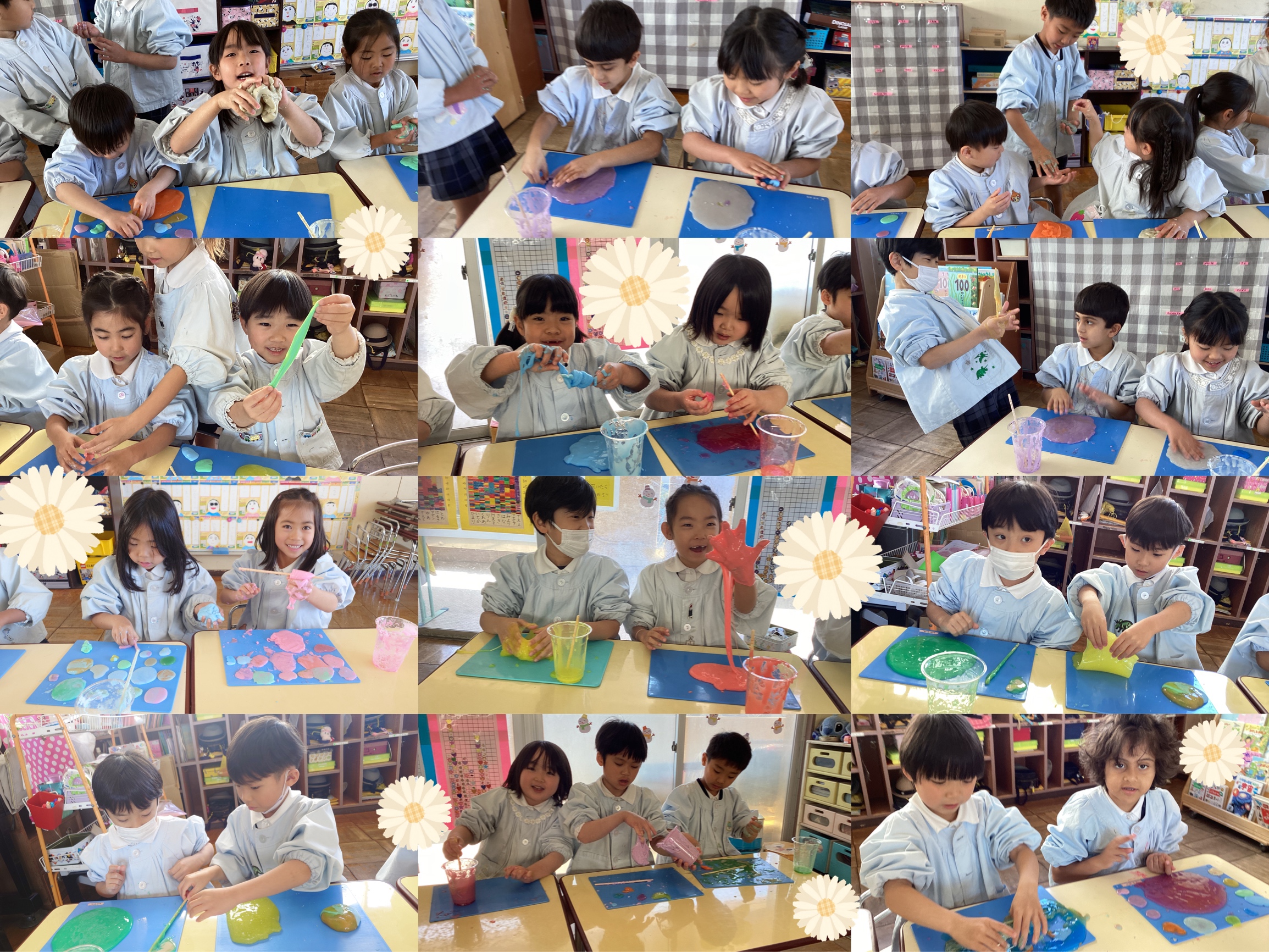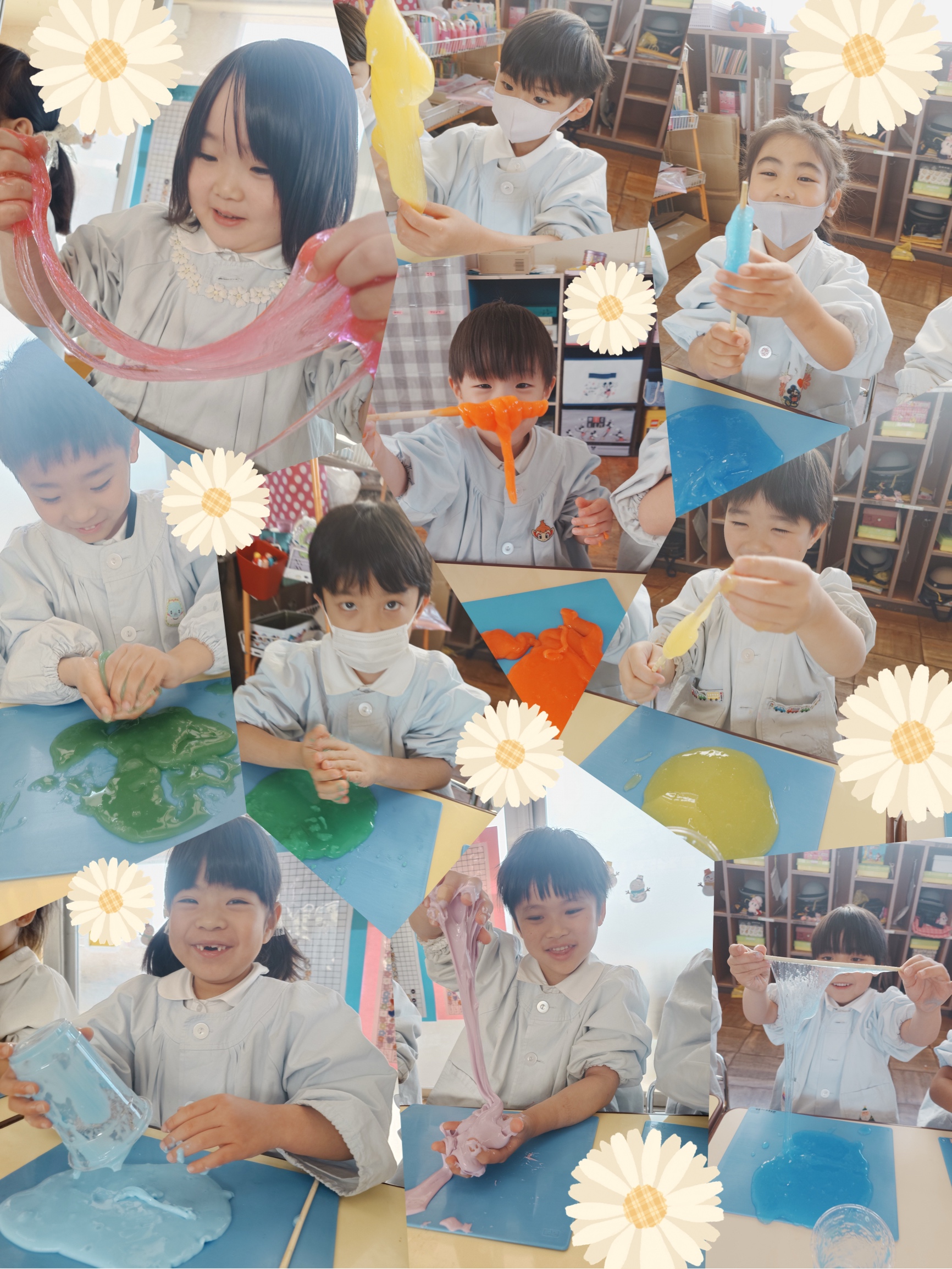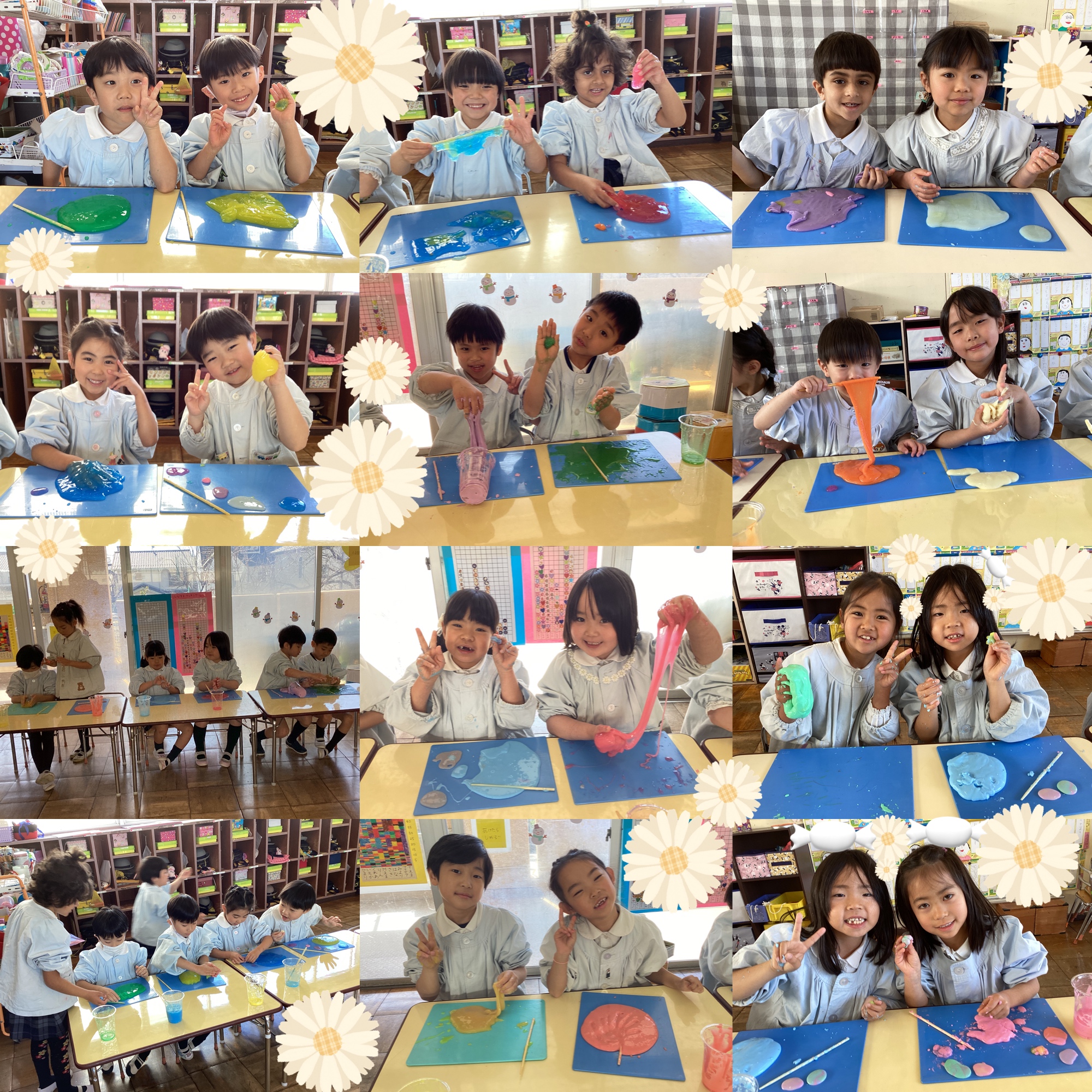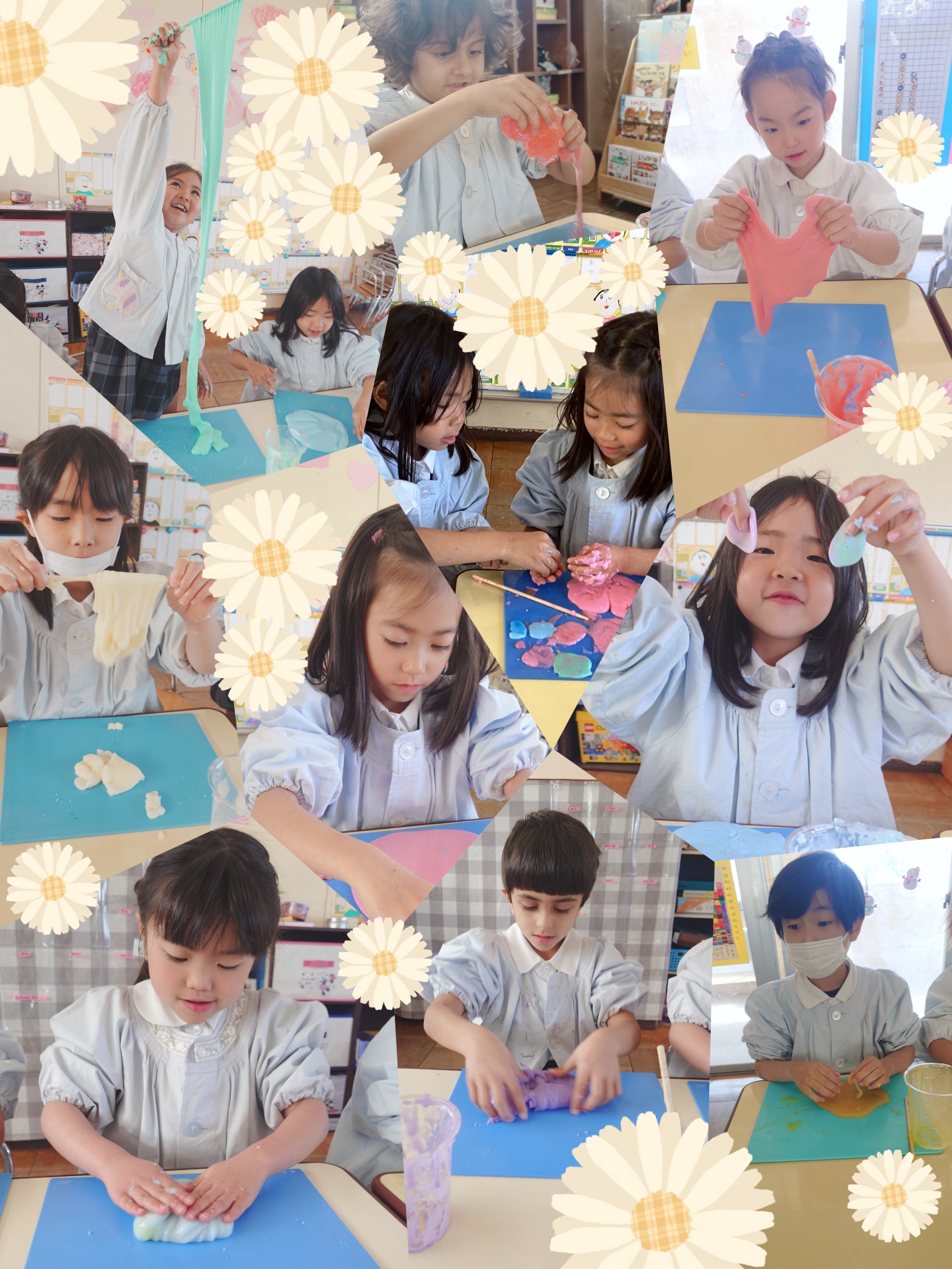 ぷにぷにの感覚が楽しくペタペタ叩いてみたり、とろーりの伸ばしてみたり、おもいおもいに楽しみました。