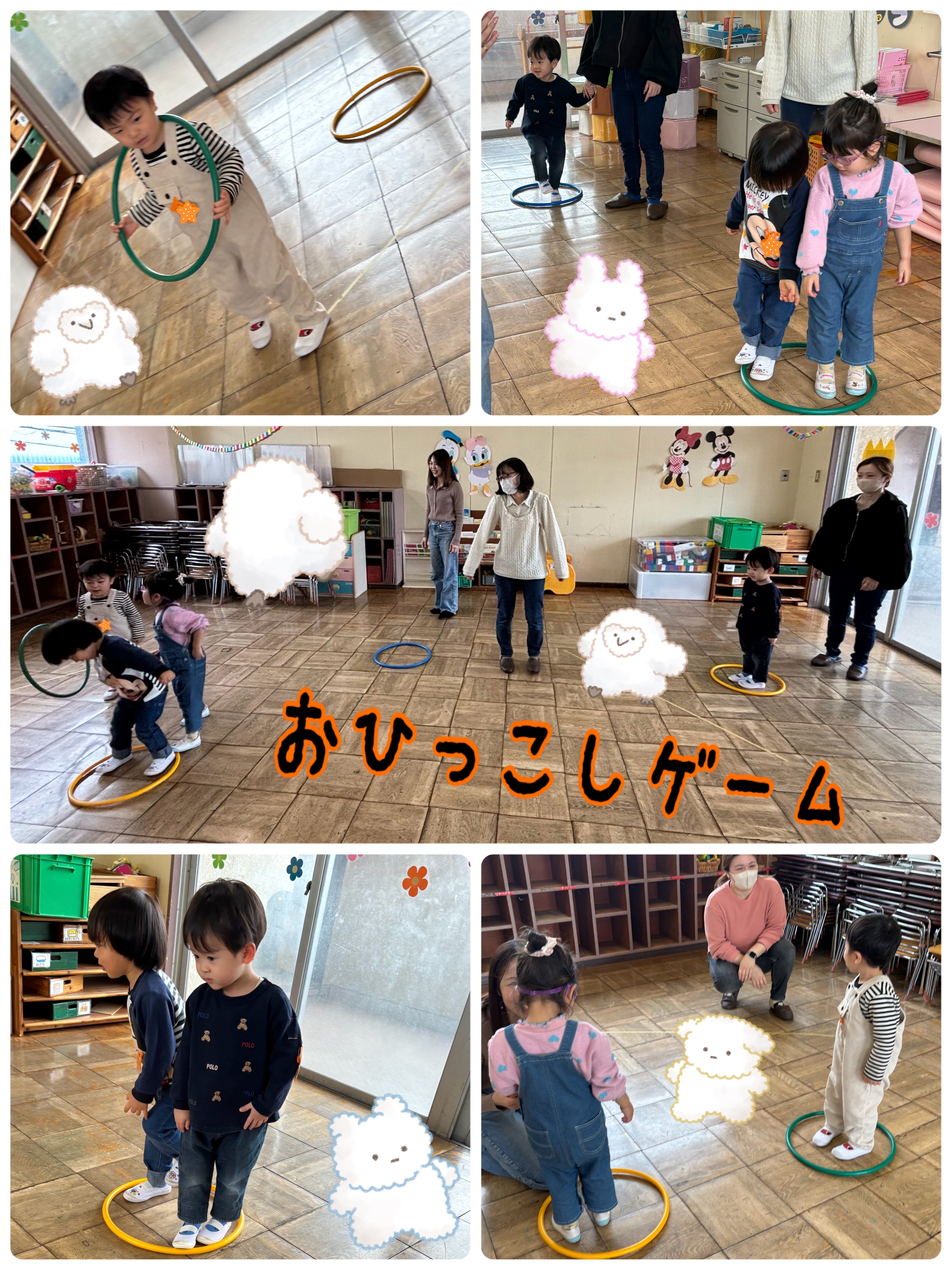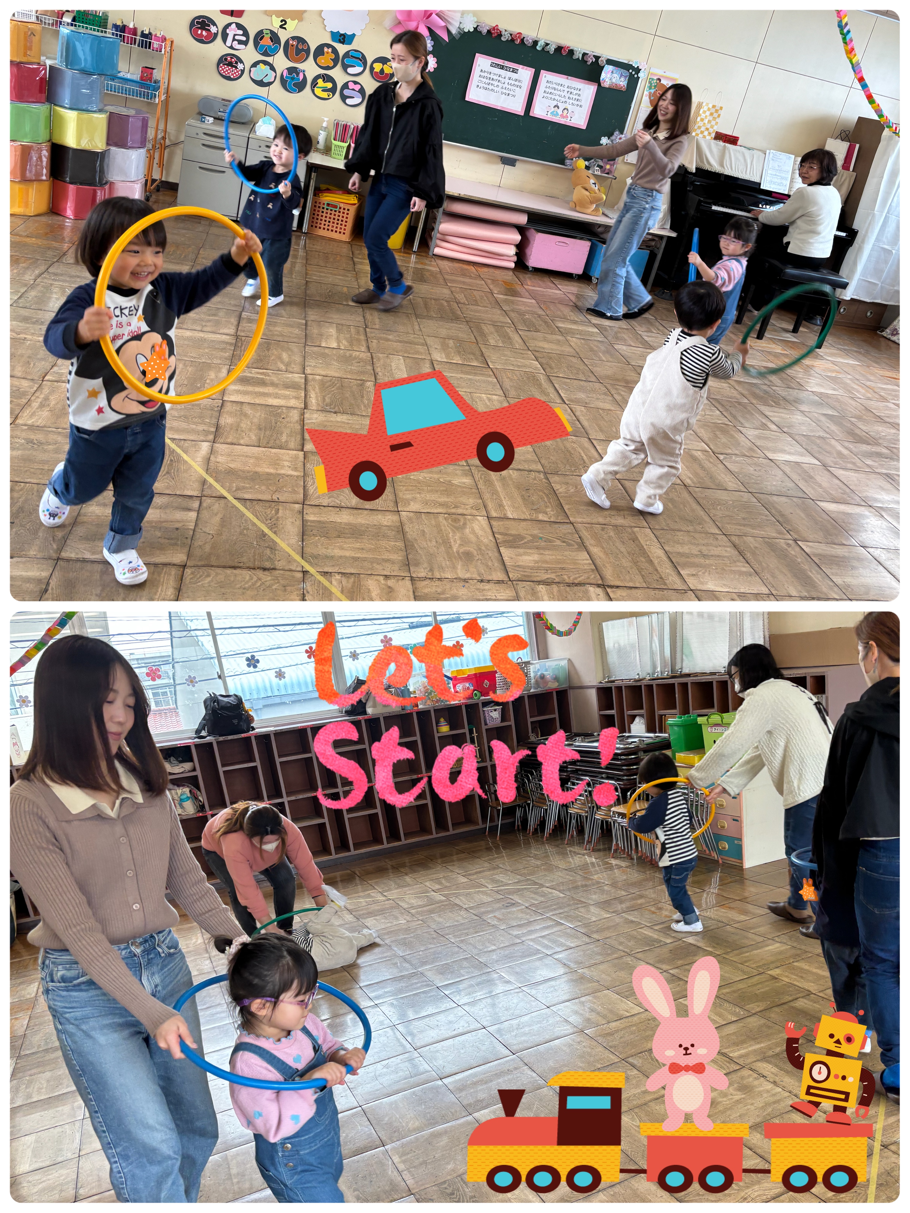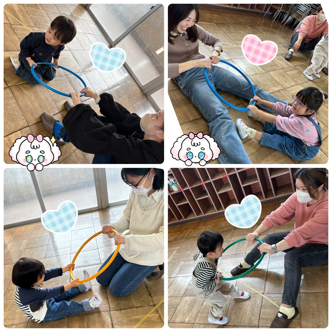 先にフープに入っているお友達に、「いれて」と上手に言って仲良しこよしでフープに入っていましたね♡