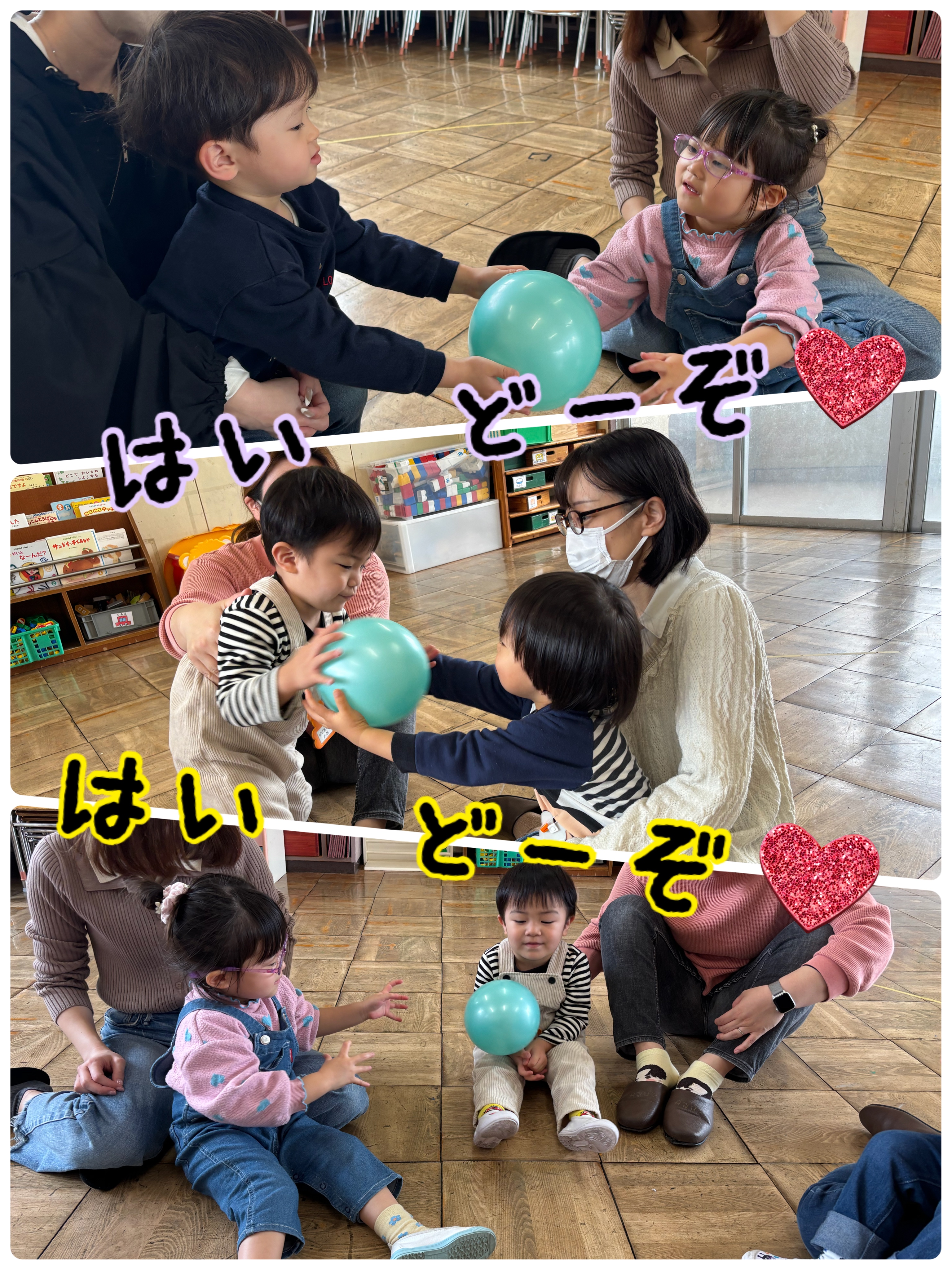 親子で輪になって座り、♪春がきた♪の音楽にのりながら隣のお友達にボールを「はい どーぞ」と渡せるかな?