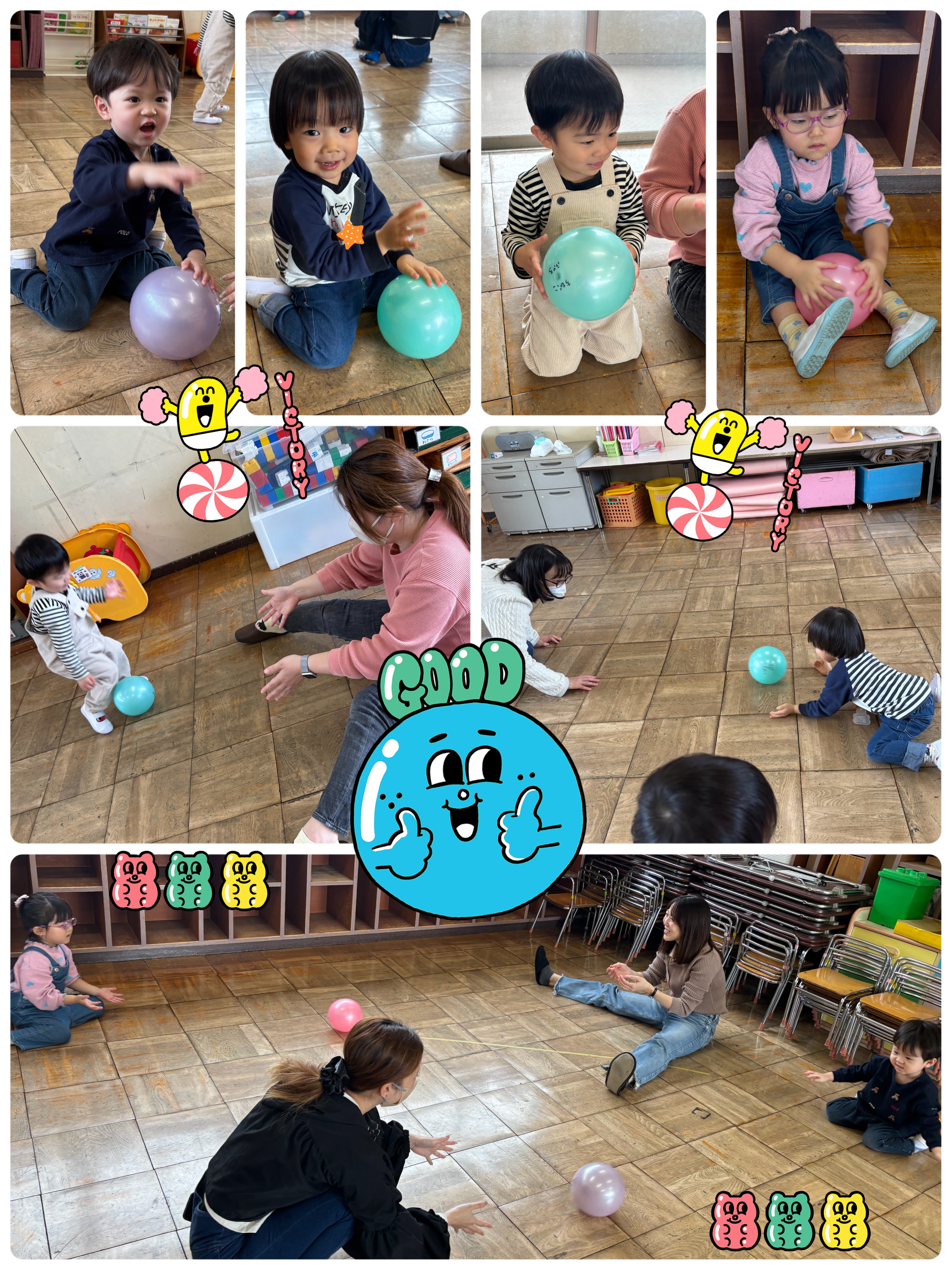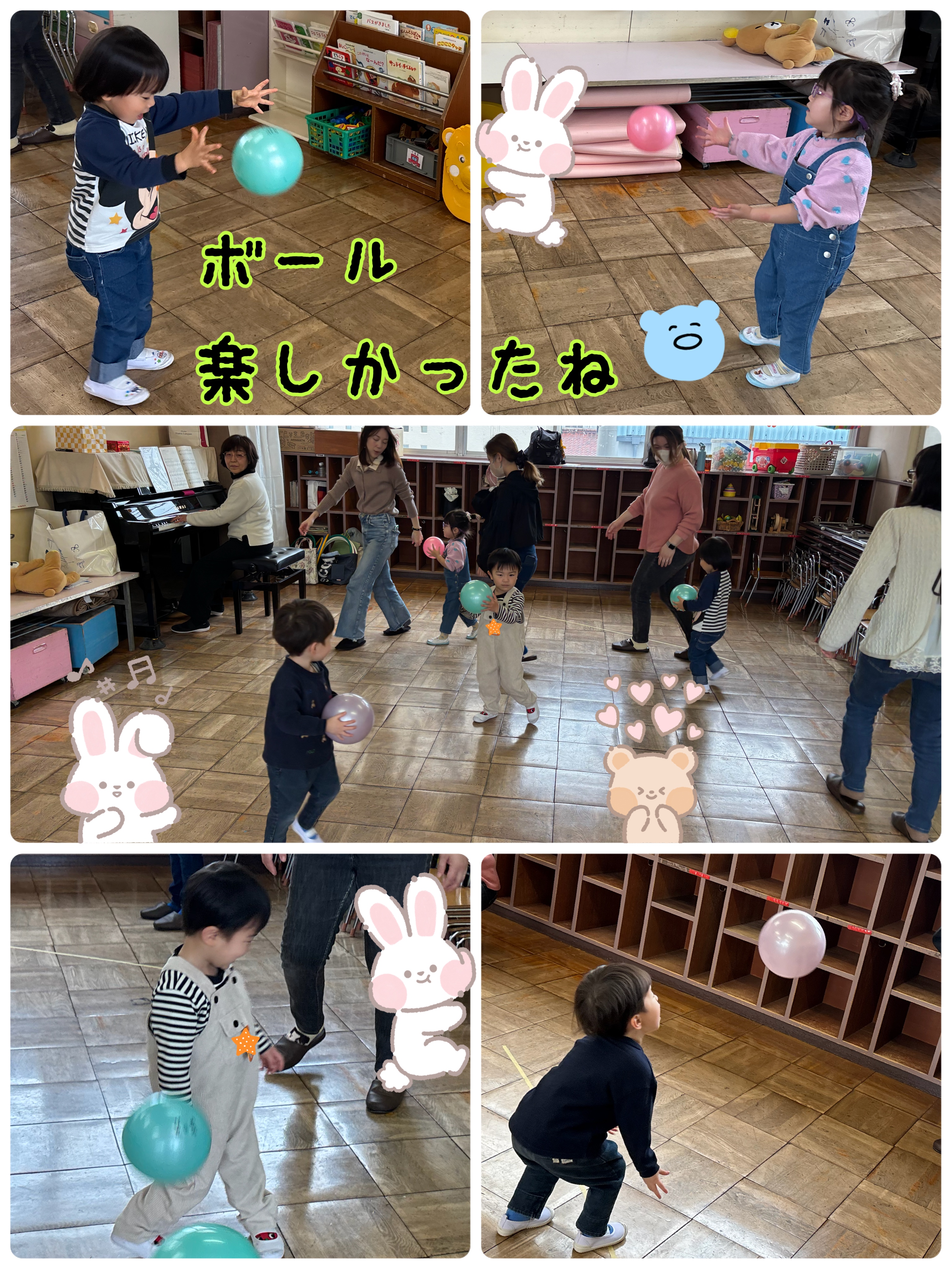 遠くにいるママとボールの転がしあっこをしたり、バウンドキャッチボールをしたりとお部屋の中をいっぱい使って、音楽にふれながらボールでたくさん遊べましたね♪(๑ᴖ◡ᴖ๑)♪