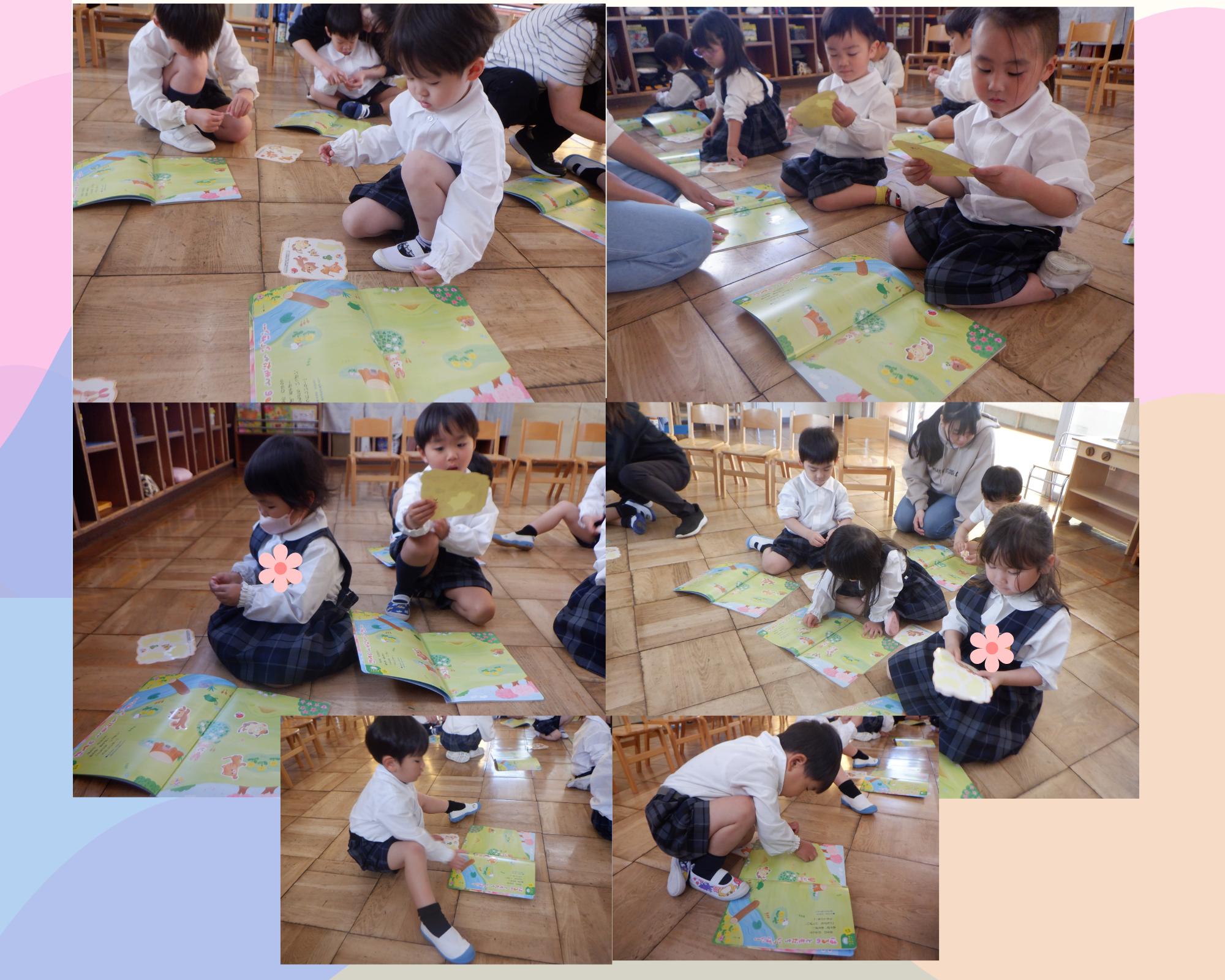 月刊誌のシール貼りもしました!絵本の絵を見ながらどこに貼ろう?と考えながら貼ることができました。