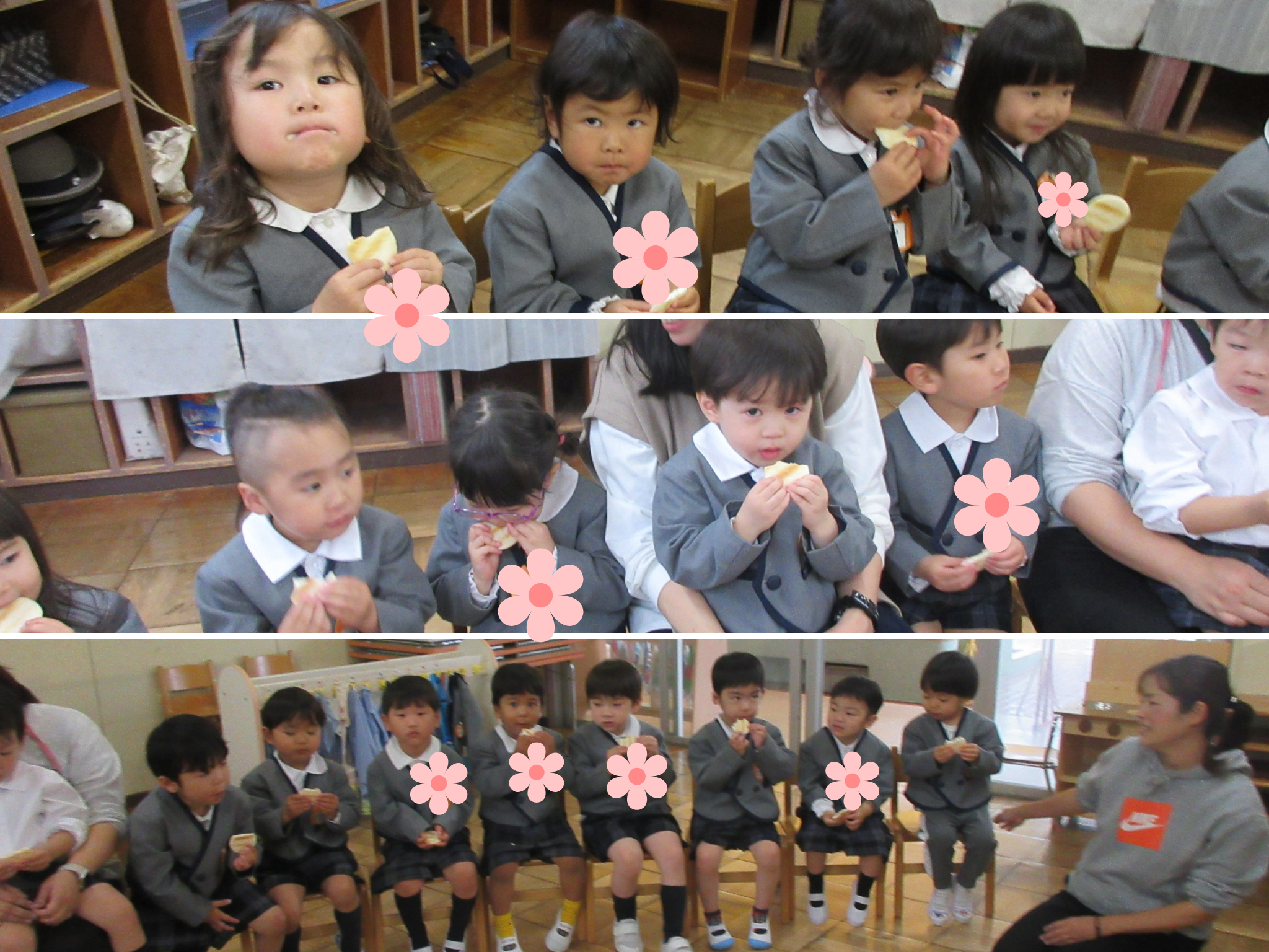 食べ終わるのが名残惜しいのか、一口が小さいお友達もいて、帰る時間だよ!と声を掛けながらおやつの時間を楽しみました。