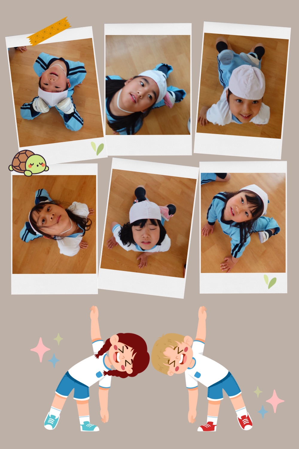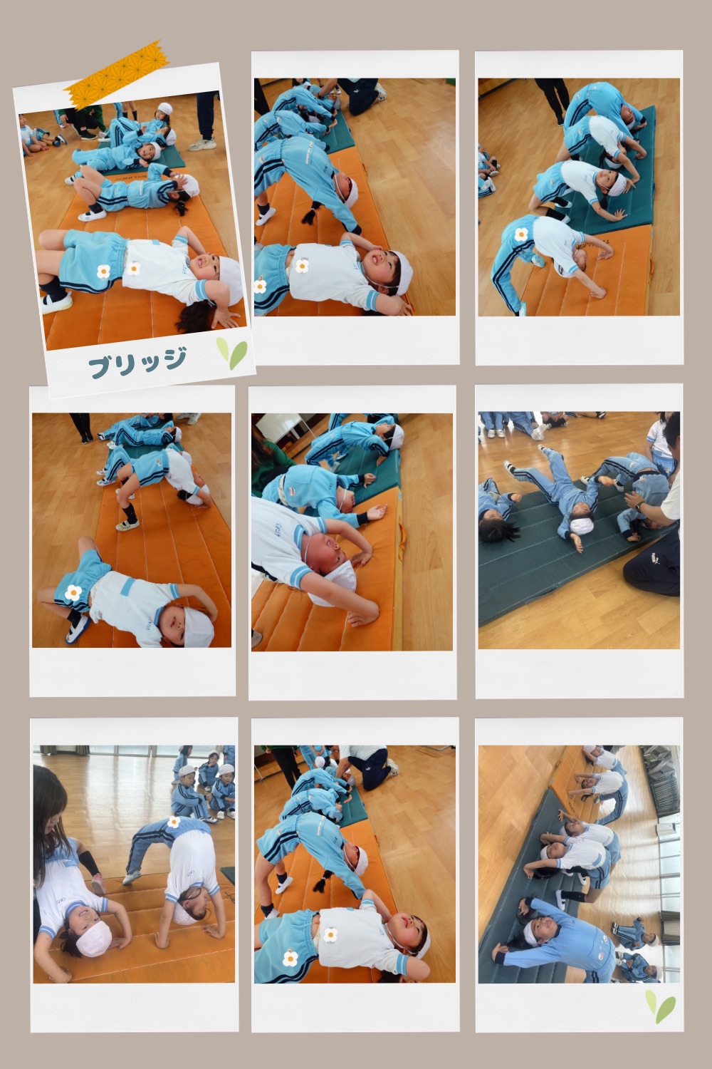 ブリッジにも挑戦しました!!初めての挑戦の子もたくさんで、手のひらの向きがまだ分からずみんなで向きを確認して頭がつかないように肘を伸ばすように頑張りました!きれいなブリッジができる子もいれば、腕が伸ばせずぺしゃんこな子も、、、😅笑